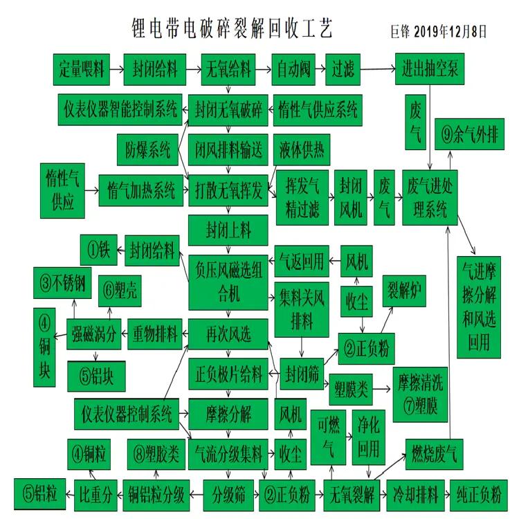 進入貧氧破碎,破碎后通過隔絕氧氣閉風排料,進入無氧高溫快速揮發(fā),經揮發(fā)后的物料進入分選系統(tǒng),把塑膜類、磁性物鐵類,電池電池中的銅鋁塑殼分選出。剩下的正負極片進入高速摩擦系統(tǒng)進行摩擦脫粉,脫粉后的物料經過氣流分選、篩選和收塵 ,把正負極粉、銅鋁金屬粒、塑膠類分開,再把帶電正負極粉送入無氧裂解系統(tǒng)中進行無氧裂解,裂解產生的可燃氣和分選時產生的廢氣進行綜合燃燒,燃燒產生的熱量為裂解爐提供熱源,并把前端分解的廢氣作為補充氧和有機氣體,焚燒后的尾氣經過簡單的廢氣、冷卻、噴淋、過濾、氣霧分離、沸石蜂窩或活性炭催化處理達標排放。