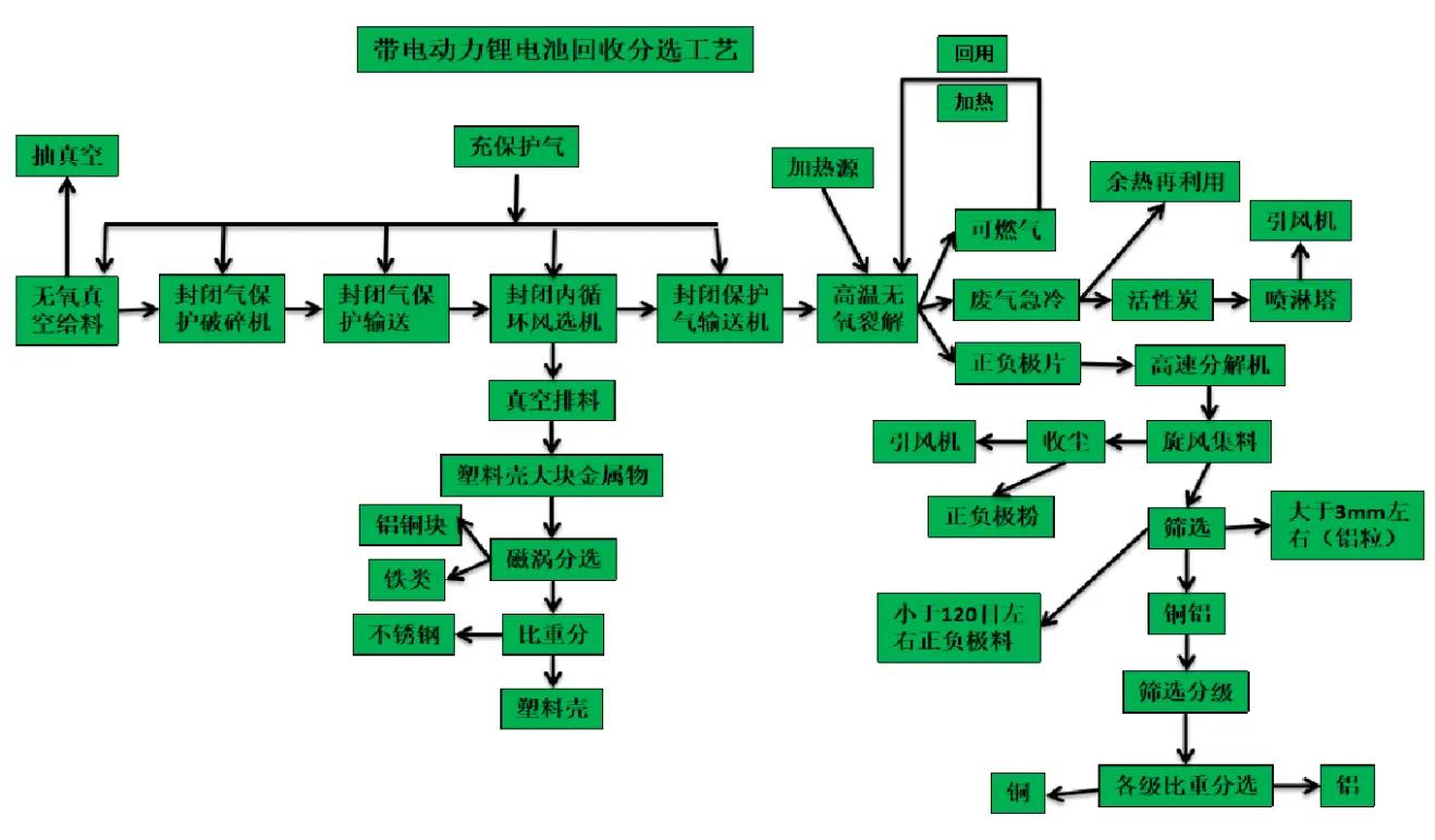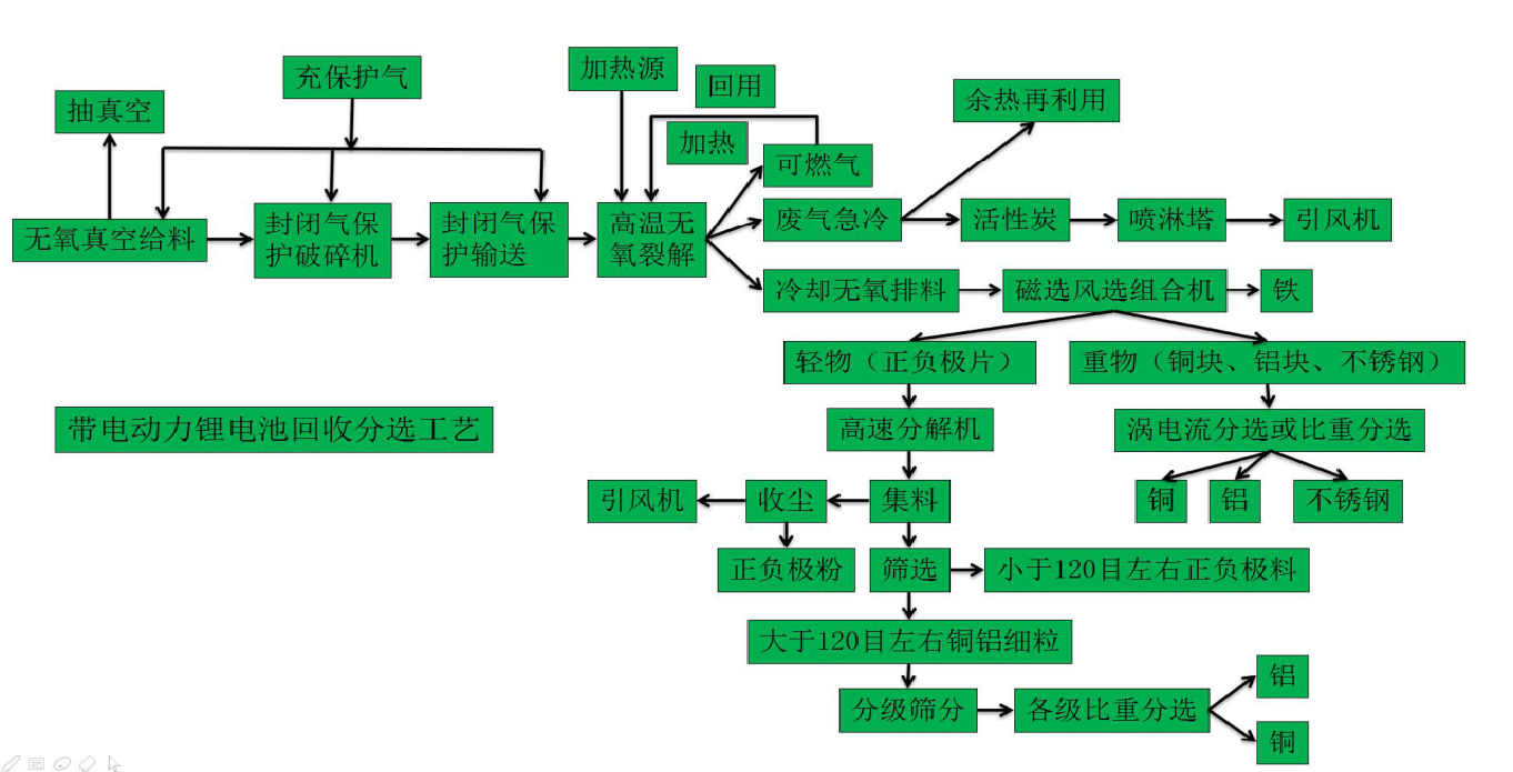 為了防止帶電的鋰電池進入系統(tǒng)會與空氣中某些帶電物質發(fā)生反應產生爆炸,所以先抽真空注入保護氣。然后就是無氧熱裂解爐進行一系列的處理。分選出資源可以在利用的物料例如,銅、鋁、不銹鋼、塑料殼等。