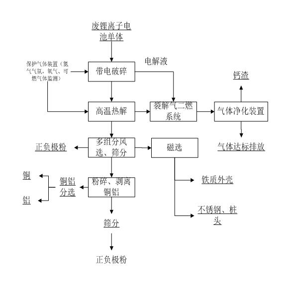 廢舊鋰電池單體破碎分選技術工藝流程整體工藝采用單體帶電的鋰電池破碎、高溫熱解、多組分篩分分選、銅鋁分選工藝,各組分物料回收率可達95%以上,極粉純度達95%-98%。該流程生產線可以處理三元動力鋰電池及磷酸鐵鋰電池,通過物理分選方法,實現鋰電池有價金屬高效回收,產品為廢舊鋰電池中的樁頭、外殼、正負極集流體、正負極粉材料。